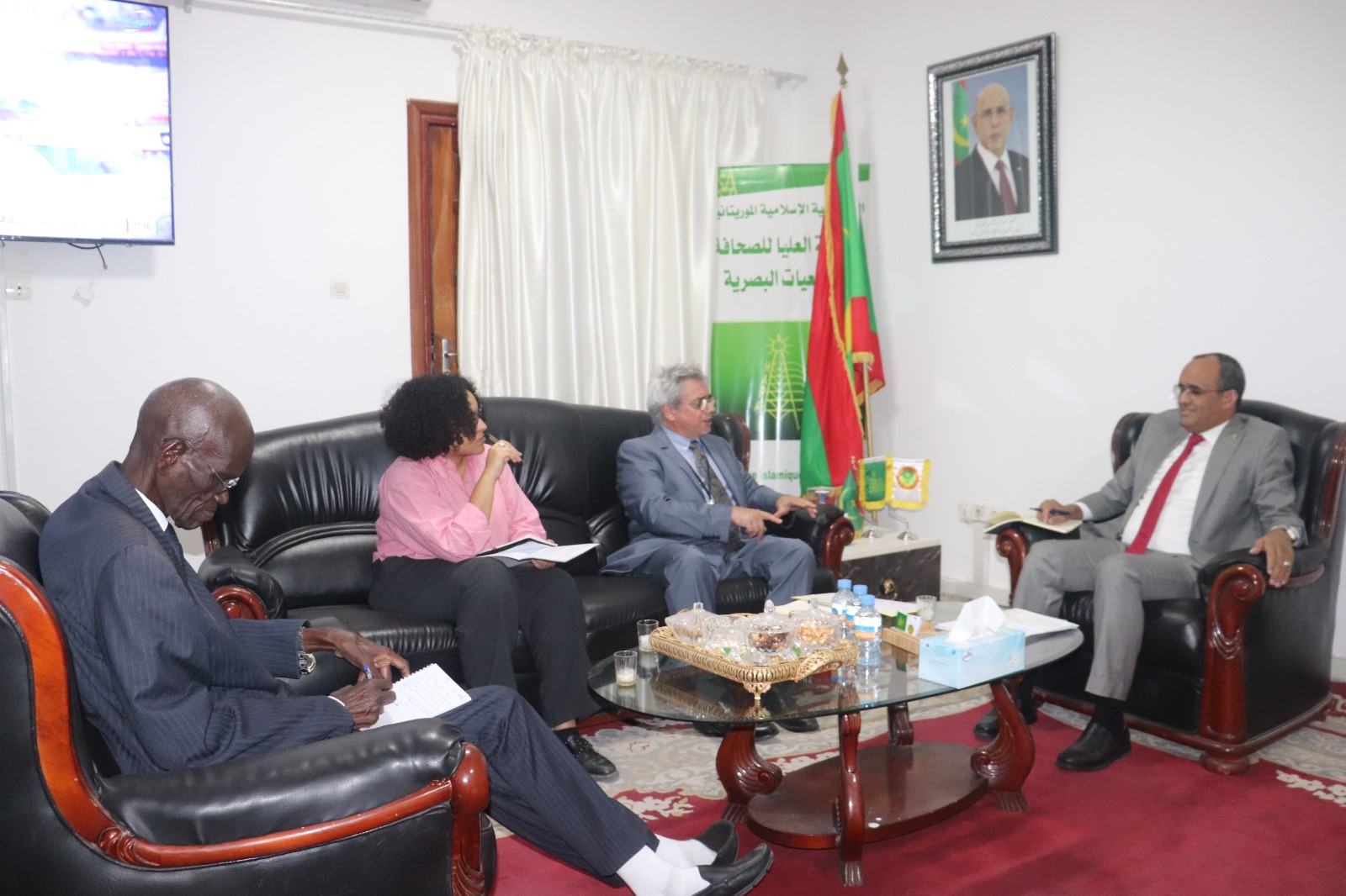 au siège de la HAPA Monsieur Bernard Rubi Conseiller de coopération et d’action culturelle de l'Ambassade de France accompagné de Hiba Ben boubaker Chargée de mission médias et société civile à l'Ambassade de France en Mauritanie dans le cadre du projet RIMédi@s.